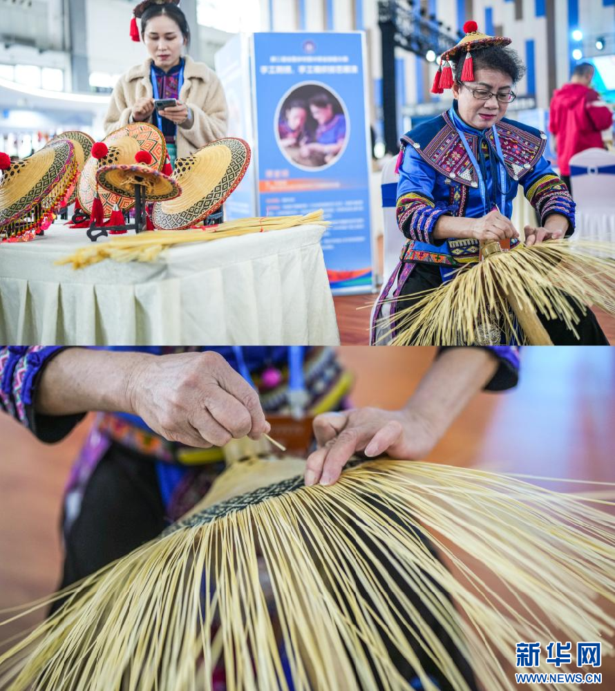 来自广西壮族自治区河池市环江毛南族自治县的谭素娟在制作编织品(拼版照片,5月8日摄)。 近日,第二届全国乡村振兴职业技能大赛在贵州省贵阳市开幕。大赛期间来自全国各地的52位手工刺绣和手工编织乡村工匠名师汇聚一堂,给观众带来精彩纷呈的非遗手工技艺展演。来自广西壮族自治区柳州市的韦清花在制作侗族刺绣(拼版...