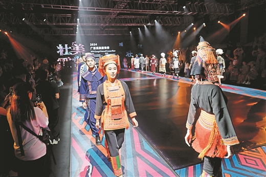4月19日晚,2024年“壮美霓裳”广西民族服饰秀在南宁市李宁体育园闪亮登场。该活动通过模特走秀、时尚走秀、儿童走秀3种形式,结合高校师生设计的时尚民族服饰,生动诠释八桂民族文化历久弥新的魅力与时代内涵。▲走秀现场。记者 邹财麟 摄 当晚的“壮美霓裳”广西民...