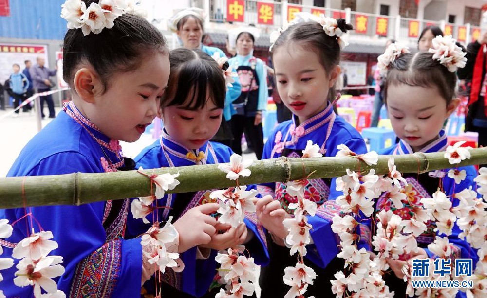 4月1日,在天峨县三堡桐花节上,几名小朋友在挑选自己喜欢的“桐花花环”。4月1日,在天峨县三堡桐花节上,居民跳起欢快的竹竿舞。这是4月1日在天峨县三堡乡拍摄的桐花。这是4月1日在天峨县三堡乡拍摄的桐花(无人机照片)。4月1日,艺人在天峨县三堡桐花节上表演舞狮。 当日,广西河池市天...