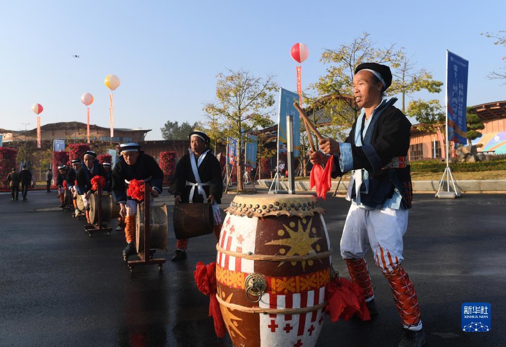 在广西河池园博园,表演人员在敲鼓迎宾。在广西河池园博园,女青年在招手迎宾。在广西河池园博园,山歌手在唱山歌。在广西河池园博园,一名山歌手通过网络直播唱山歌。在广西河池园博园,表演人员进行敲鼓表演。 近日,第十三届广西(河池)园林园艺博览会在河池市宜州区开幕,当地独具特色的民族...