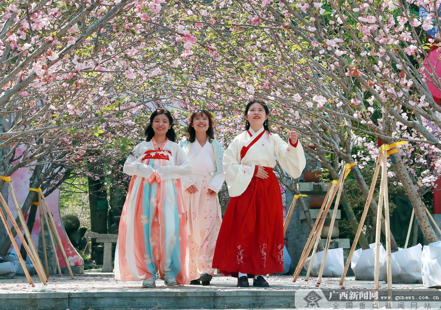4月5日,游客在南宁龙门水都景区樱花园游览赏花。“壮族三月三“假期间,该景区举办第二届·醉美樱花节,一场粉色浪漫的樱花视觉盛宴吸引了众多游客前来踏春赏景,享受假日时光。记者 何运斌 摄