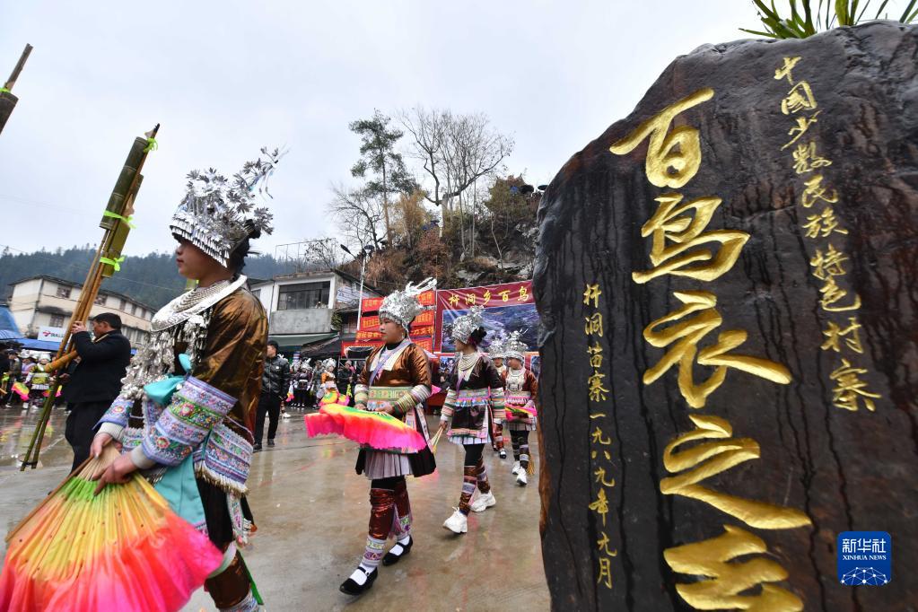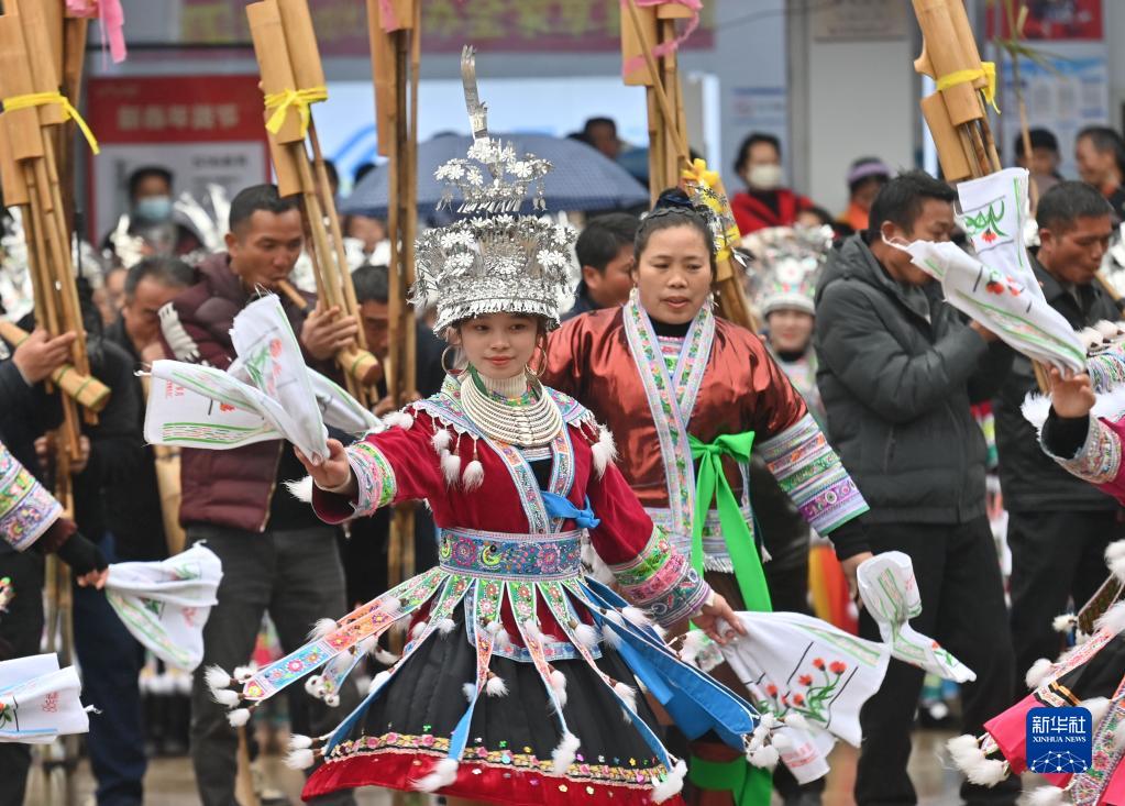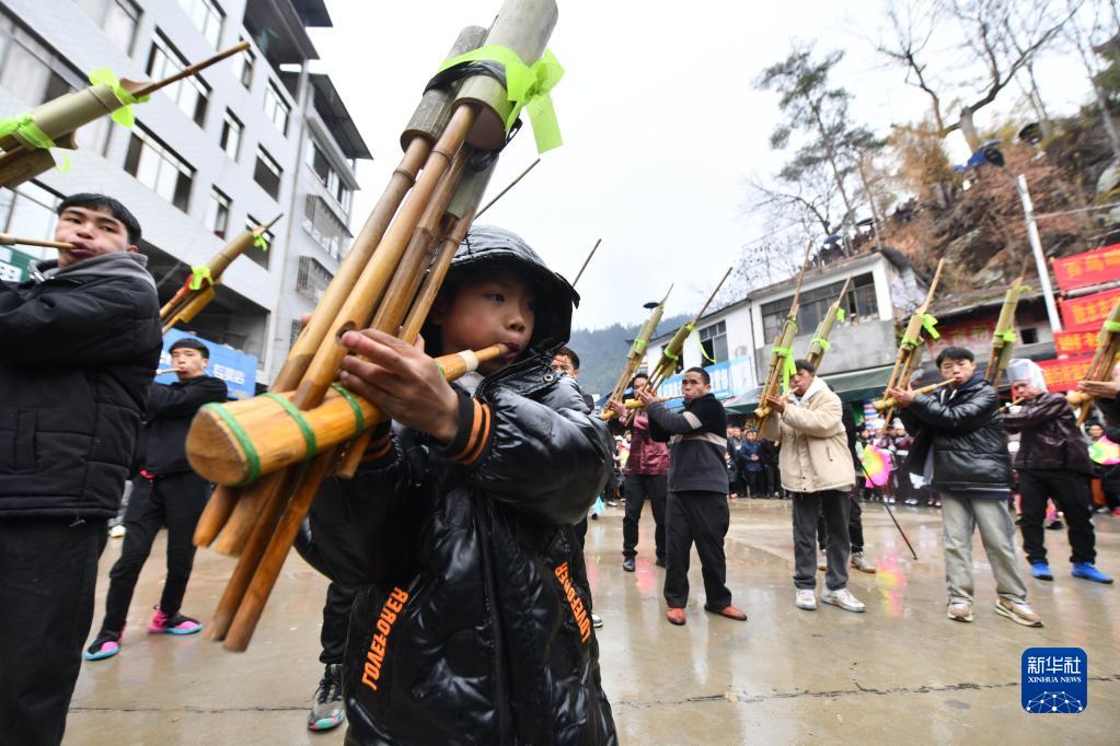 2月2日,融水苗族自治县杆洞乡党鸠村苗族同胞在吹芦笙。