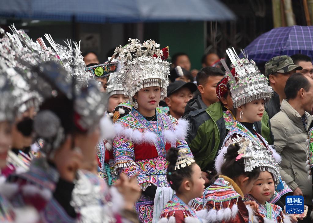 2月2日,融水苗族自治县杆洞乡苗族姑娘在观看民俗表演。