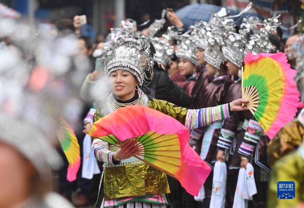 2月2日,融水苗族自治县杆洞乡苗族姑娘在跳苗舞。