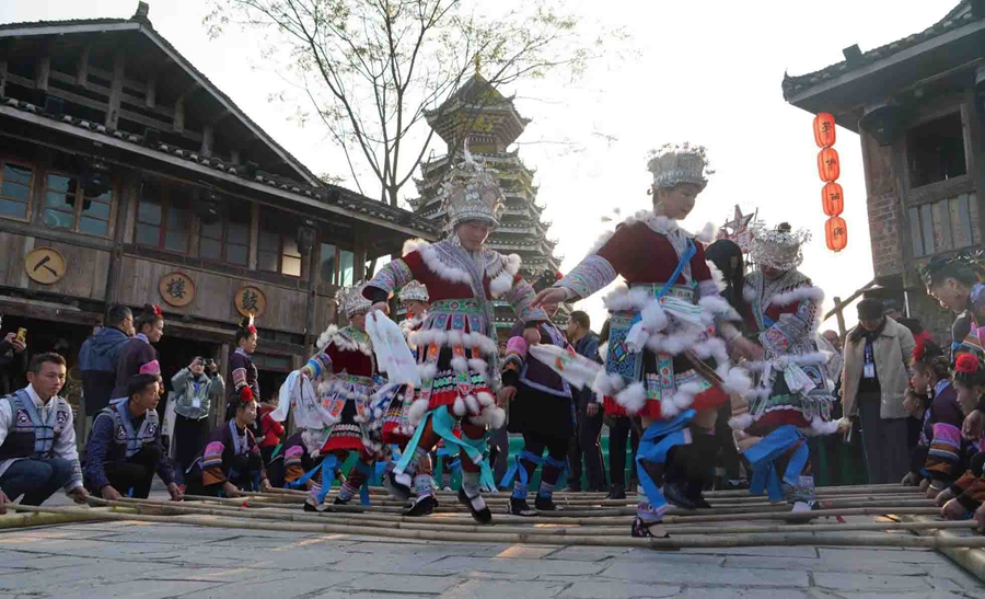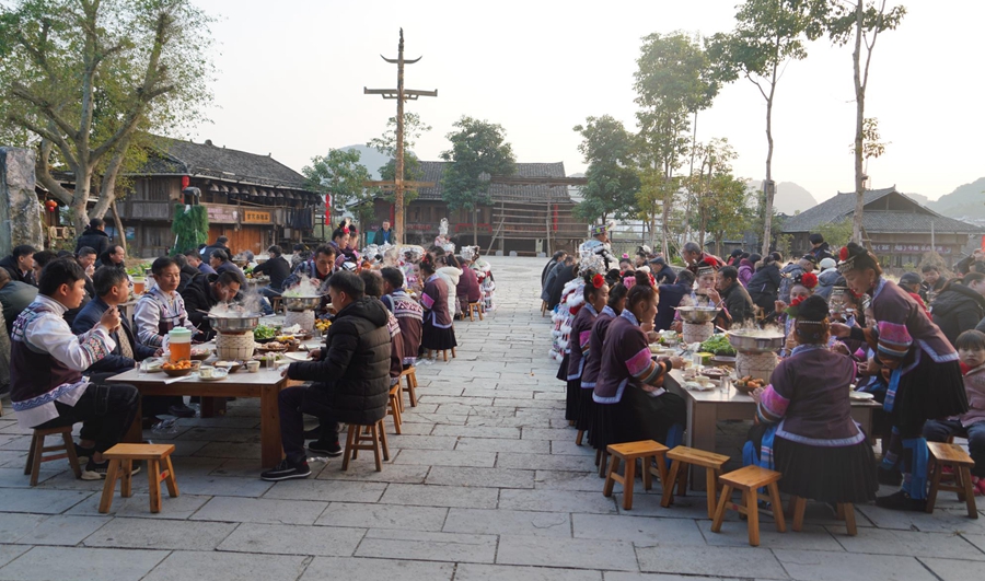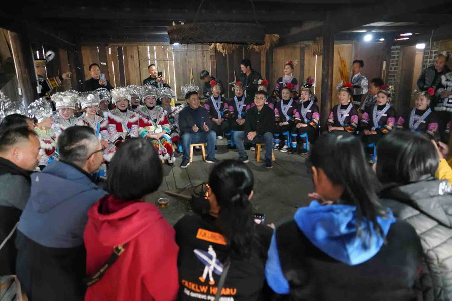 12月10日,融水杆洞驻融芦笙队来到融水梦呜苗寨开展“打同年“活动。“打同年“是融水苗族自治县一带苗族同胞的民族习俗。“打同年“是苗族村寨之间开展的联谊活动。