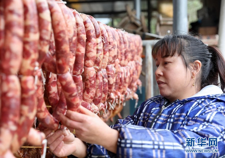 三江侗族自治县丹洲镇丹洲村村民在制作腊味。