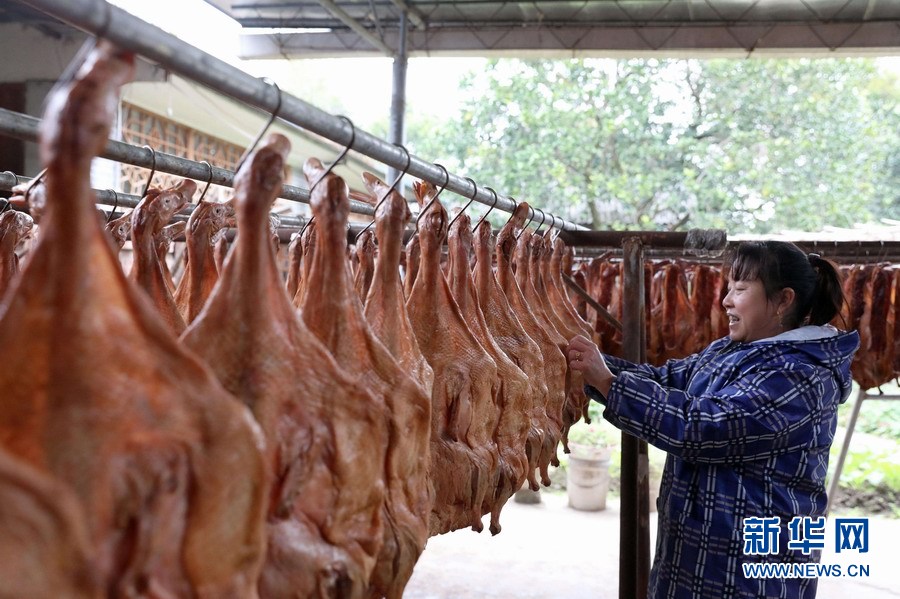 在三江侗族自治县丹洲镇丹洲村,村民在自家阳台上挂满腊鸭。