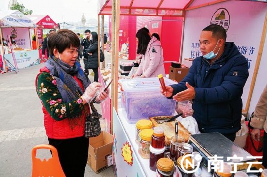 当日,在农特产品区,那马蔬菜、那陈鸭、大塘鸡、玉洞蜂蜜、澳洲坚果等特色产品琳琅满目,以优良的品质和实惠的价格吸引市民游客争相购买。