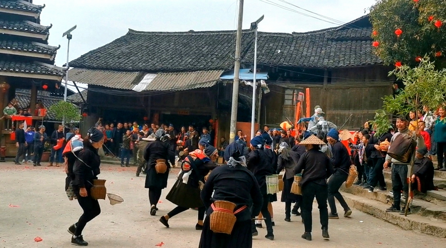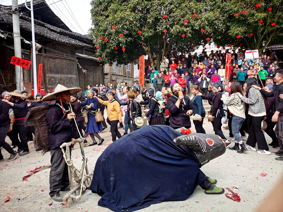 2月15日,当地侗族群众在龙胜各族自治县乐江镇地灵村开展“闹春牛“活动喜过新春佳节。