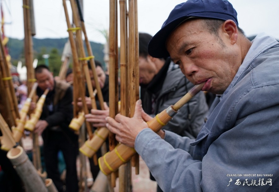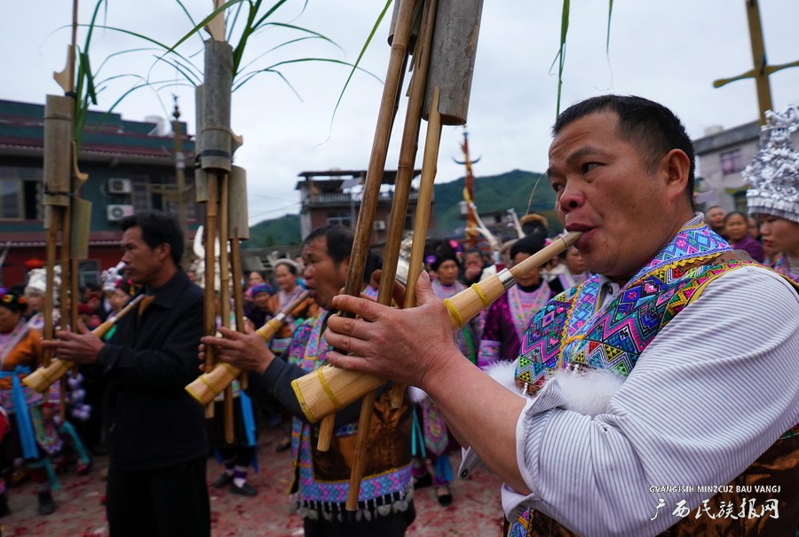 2月27日,在融水苗族自治县香粉乡古龙坡,苗家汉子在吹奏芦笙。