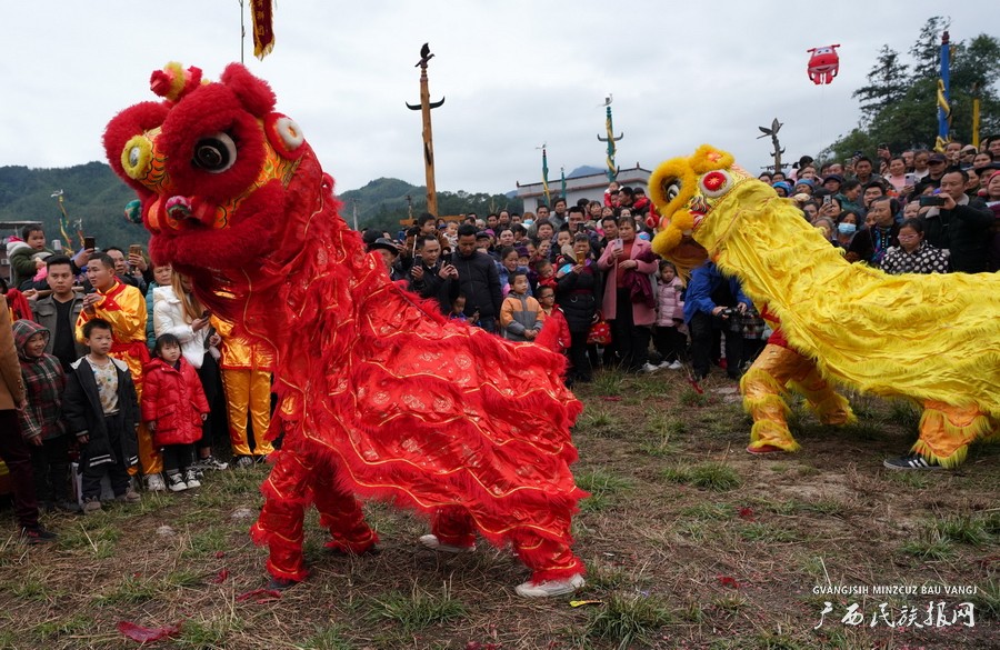 2月27日,在融水苗族自治县香粉乡古龙坡,少数民族群众在观看舞狮表演。