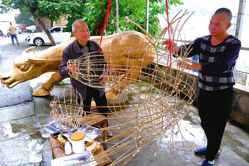 手工花灯传承人黎炳生和儿子黎达正在制作花灯