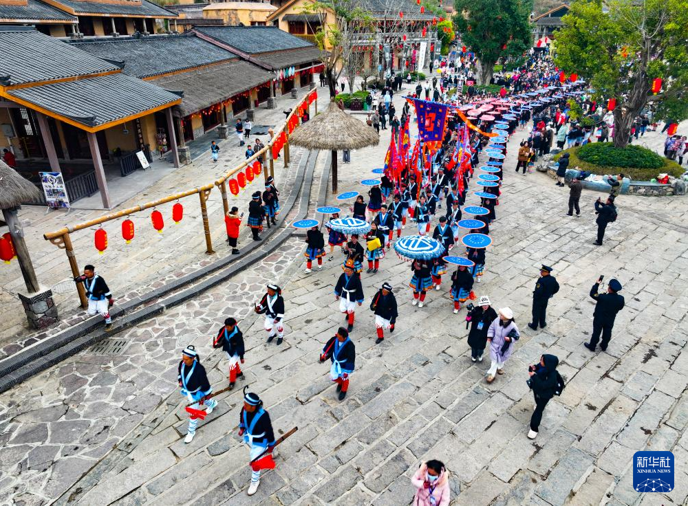 2月23日,白裤瑶群众在南丹县里湖瑶族乡瑶望天下景区进行瑶王巡寨非遗项目展示(无人机照片)。 当日,广西南丹县在瑶望天下景区举行千鼓颂春年街启动仪式,拉开广西南丹“千鼓闹元宵·万人逛年街”白裤瑶年街民俗文化旅游活动的大幕,黔桂两省区万名白裤瑶群众欢聚一堂赶年街,迎接元宵佳节到来。&n...