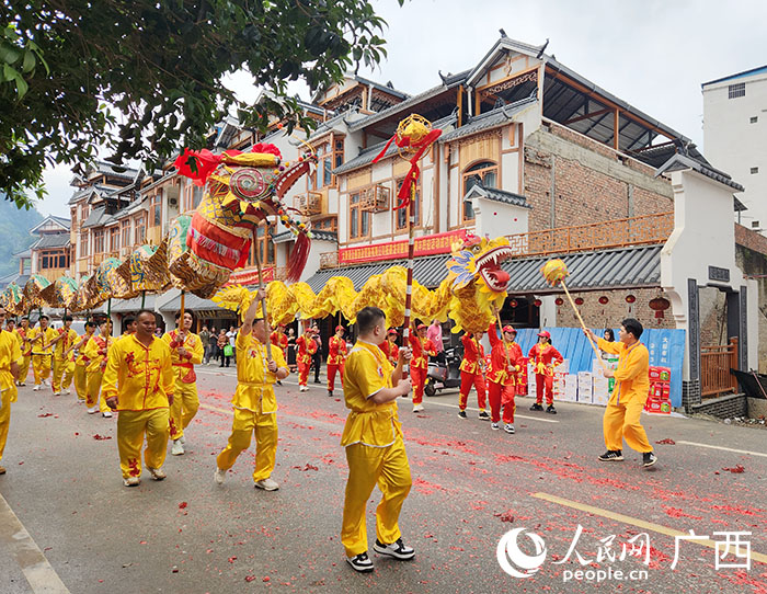 人民网大新4月24日电 (记者黄子婧)4月23日,农历三月十五,是崇左市大新县硕龙镇硕龙街一年一度的建街日,当天,该镇举办系列丰富多彩的民俗活动,庆祝建街140周年,推进乡村文化和边境旅游业深度融合,助力打造硕龙镇文化旅游和中越边关风情旅游带品牌。舞龙游街。人民网记者 黄子婧摄...