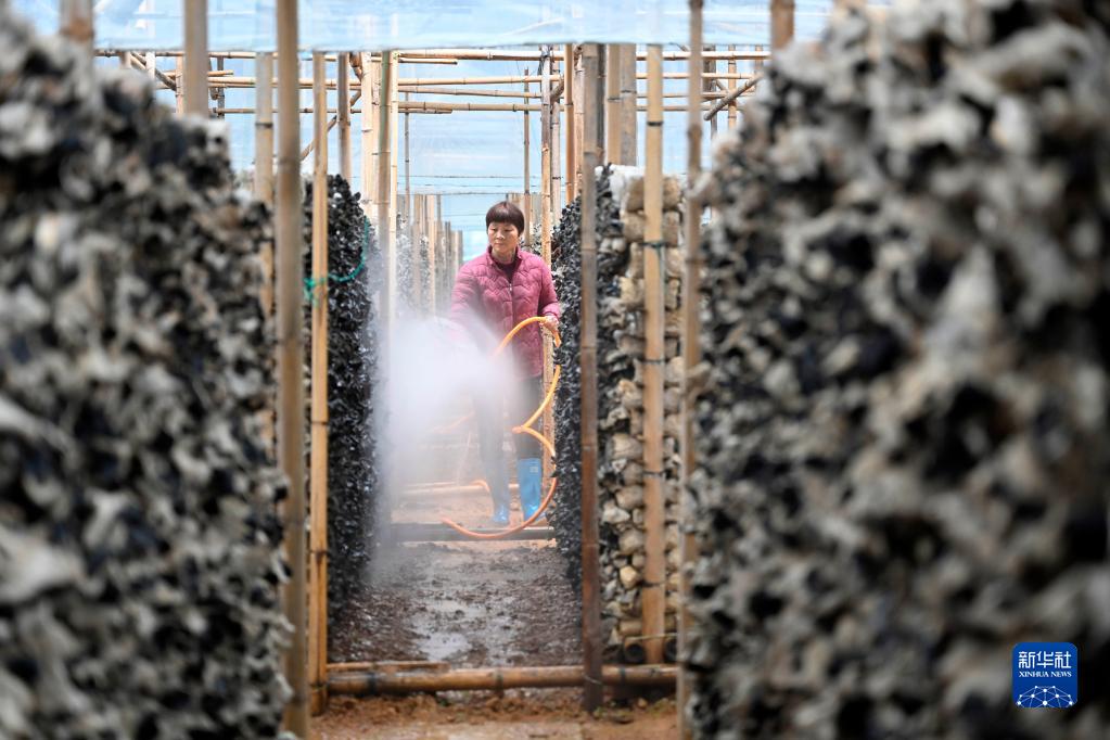 3月27日,在柳州市柳城县社冲乡柳州螺蛳粉原材料基地里,农民在木耳基地大棚里浇水。