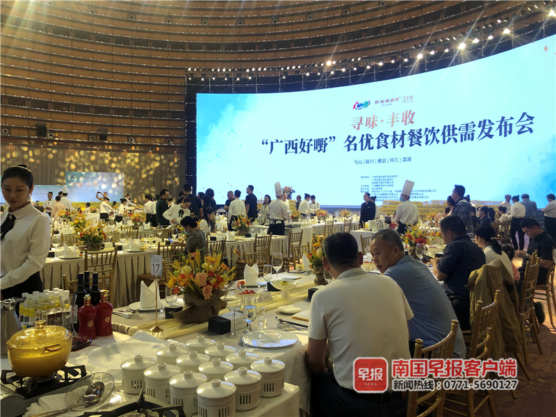 发布会上,来自马山、陆川、横县、环江、荔浦五县市的领导、农户代表来到活动现场,为家乡特产“代言“。以5款广西好食材制作的清汤马山黑山羊炖羊肚菌、堂涮陆川土猪雪花肉、横县脆皮茉莉鸡配广西酸野、荔枝木烤环江香牛配煲仔饭、荔浦芋蓉官燕配糖心荔浦芋等6款菜品依次呈现,在还原食材自然真味的同时,也向到场宾客展现出粤式餐饮的精湛技艺。