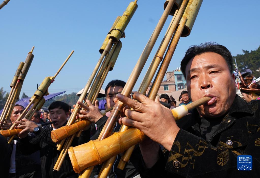 1月9日,在融水县良寨乡,村民在吹奏芦笙。