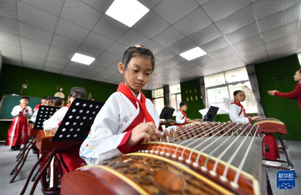 12月6日,广西梧州市藤县濛江镇中心校学生在课堂上练习古筝。