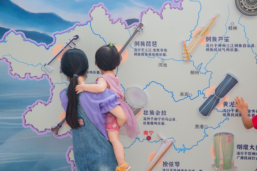 此次民乐展览以广西全区地图为画布,将马骨胡、波咧、天琴、侗族琵琶、壮族会鼓、独弦琴、侗族芦笙、黄泥鼓、烟墩大鼓、铜锣(演奏型)、蜂鼓等十一种具有广西当地民族特色的民族乐器置于其上,并在地图中植入互动装置,参馆游客轻触互动按钮,便可欣赏到十一种广西特色民乐。地图上还会显示乐器的形状、其发源地及其展厅指引,让游客除了能观赏实物,还能了解十一种乐器相关知识。