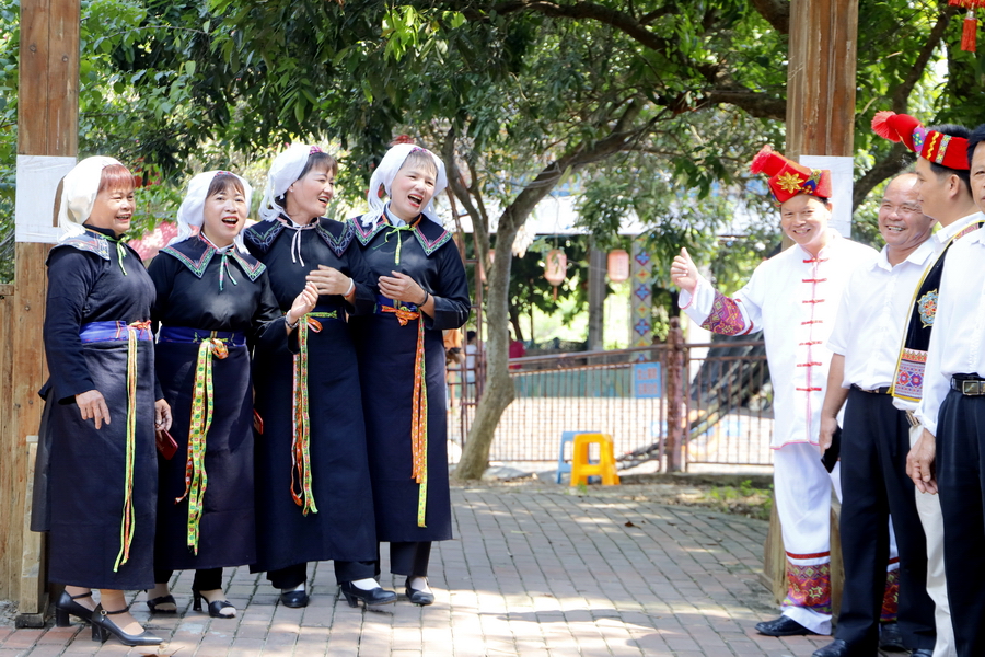 图为10月7日,在大新县“新屯农家乐旅游“景区,大新县山歌手在参加分组山歌对唱活动中。当天是国庆长假的最后一天,该县近百名高腔诗蕾山歌手欢聚在一起,以分组对唱山歌的形式,用最甜美的歌声庆祝祖国72华诞。(黄德民)