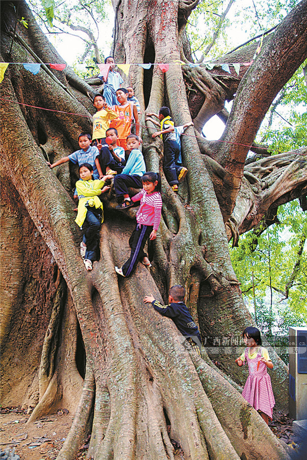 在凌云县朝里瑶族乡九联村那荷屯,孩子们爬上古榕树观看演出。