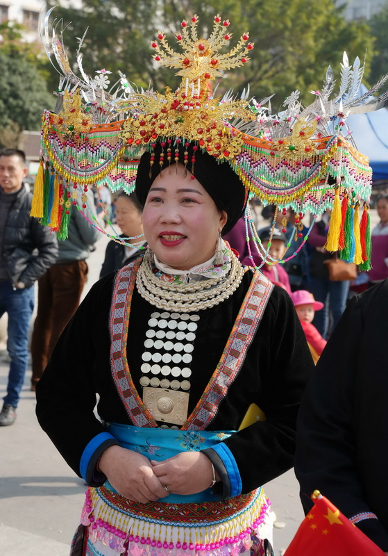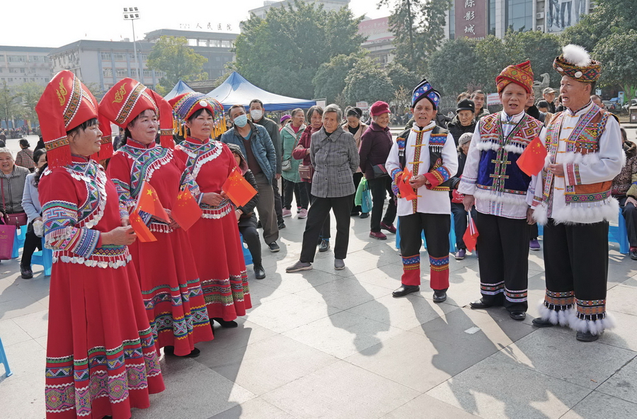 在柳州市融水苗族自治县民族广场,苗族歌手在苗歌宣传法治。