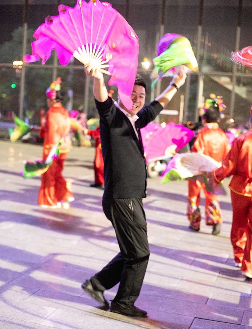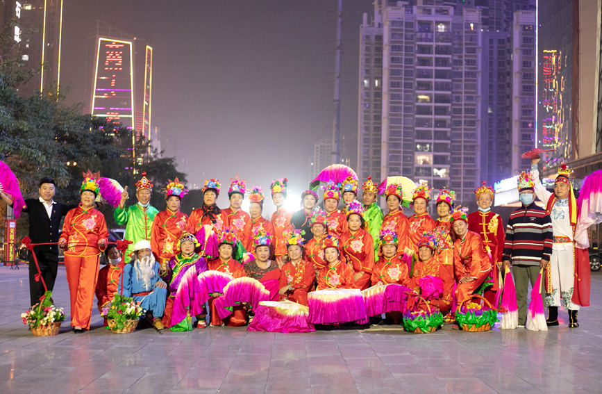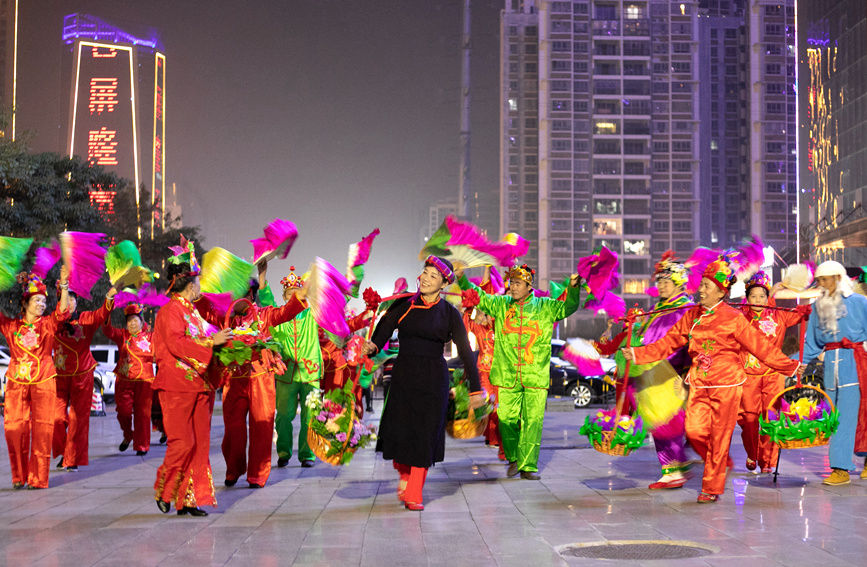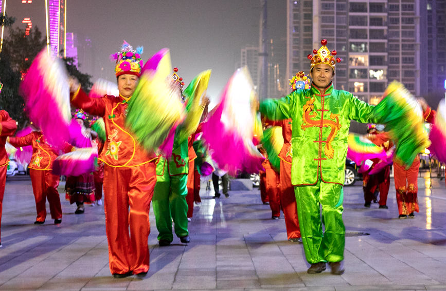除了伏波文化公园,晚上8点钟,白鹭公园、金地时代广场等地的秧歌队员们,也已经开始扭动起来。