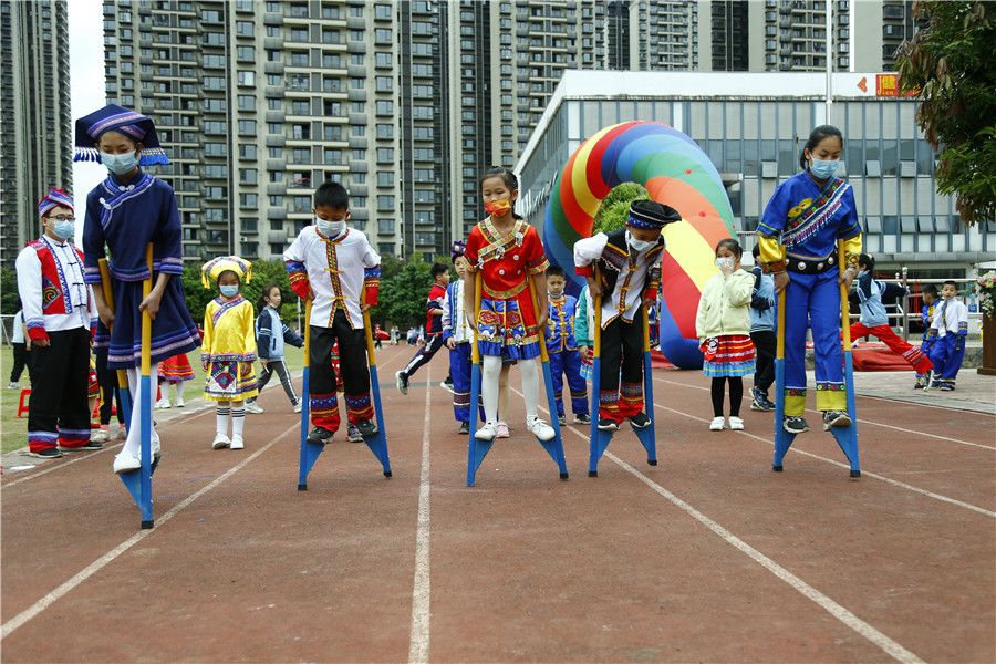 学生参加踩高跷民俗体育活动。潘志安 摄