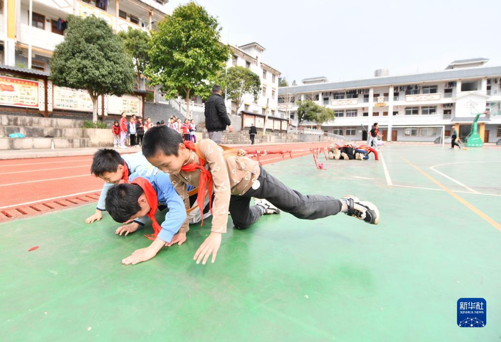 2月22日,广西蒙山县夏宜民族学校学生在体育课上进行“大象拔河”。
