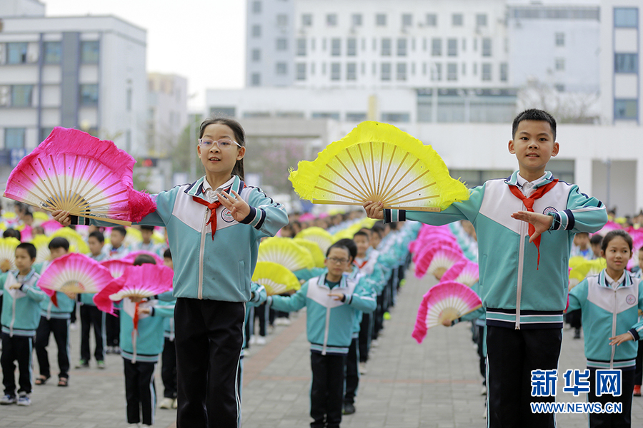 在广西河池市宜州区第一小学龙降校区,同学们在学习耍花扇。新华网发 覃慧 摄