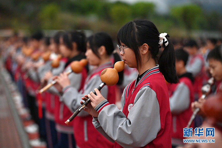 在广西梧州市苍梧县第一初级中学,同学们在阳光大课间吹奏葫芦丝。新华社记者 黄孝邦 摄