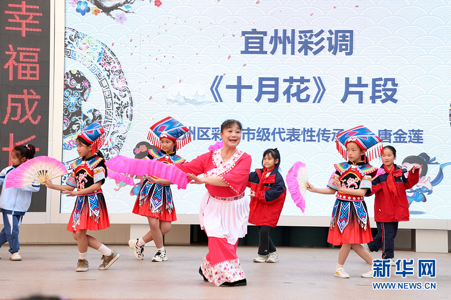 在广西南宁市长堽路小学开展的“戏曲进校园”主题活动。新华网发