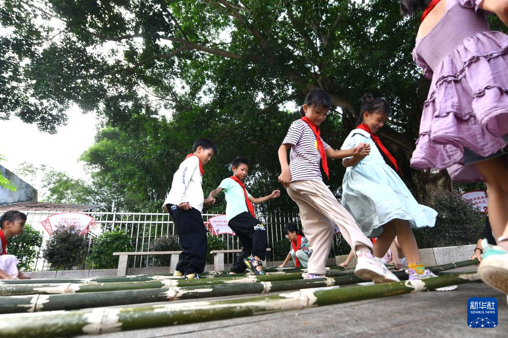 9月26日,在梧州市长洲区古道小学,学生们在大课间跳竹竿舞。