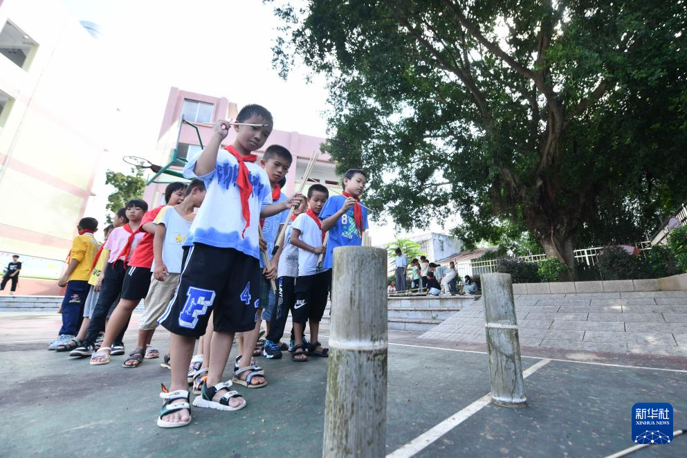 9月26日,在梧州市长洲区古道小学,学生们在大课间练习投壶。