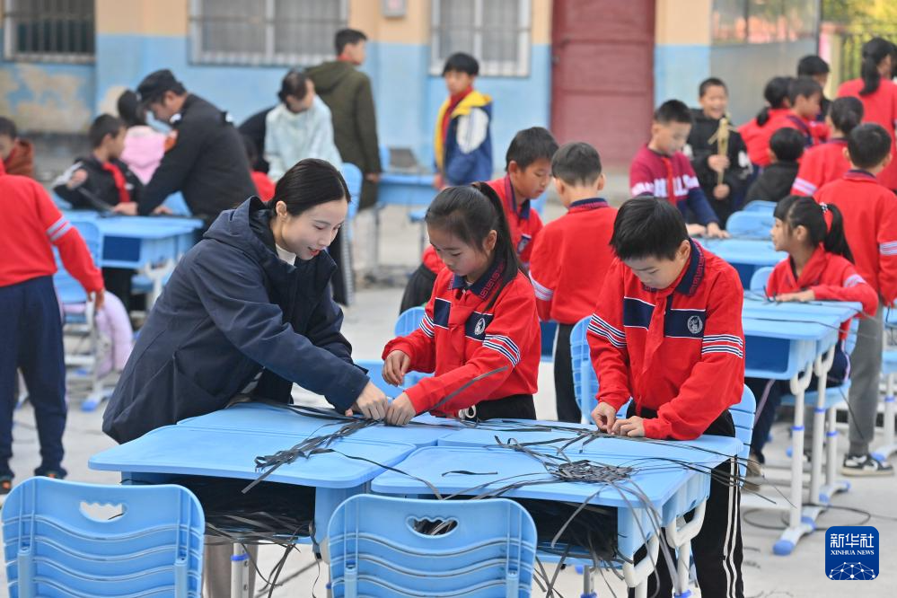 12月8日,在梧州市长洲区大桥小学,李焕然老师(右二)在课堂上指导学生编织手工艺品。