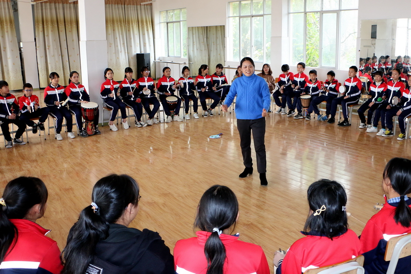 12月2日,在鹿寨县导江小学乡村少年宫,县文明办派出心理辅导志愿者向留守学生、脱贫儿童一起传授敲军鼓,在敲军鼓中锻炼大家的团结写作进取精神。今年送教活动以“疫路同行·鼓舞童心“为主题,通过心理辅导,普及心理健康知识,有效服务学校心理健康的教育,全面提高素质教育水平。赖建辉/摄