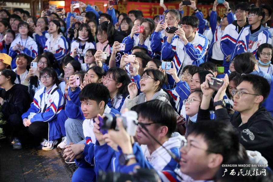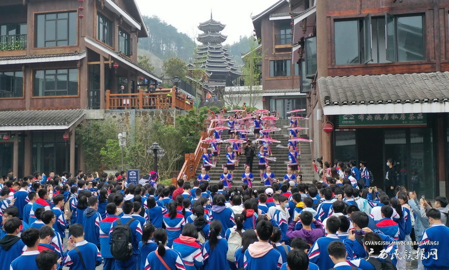 3月26日,柳州市铁一中千名师生走进三江侗族自治县开展研学之旅活动,先后到程阳八寨、布央仙人山、县城大侗寨等景区观侗楼、品侗茶、尝侗宴、赏侗情,倾情体验侗乡原汁原味的多彩风情。(通讯员 龚普康)