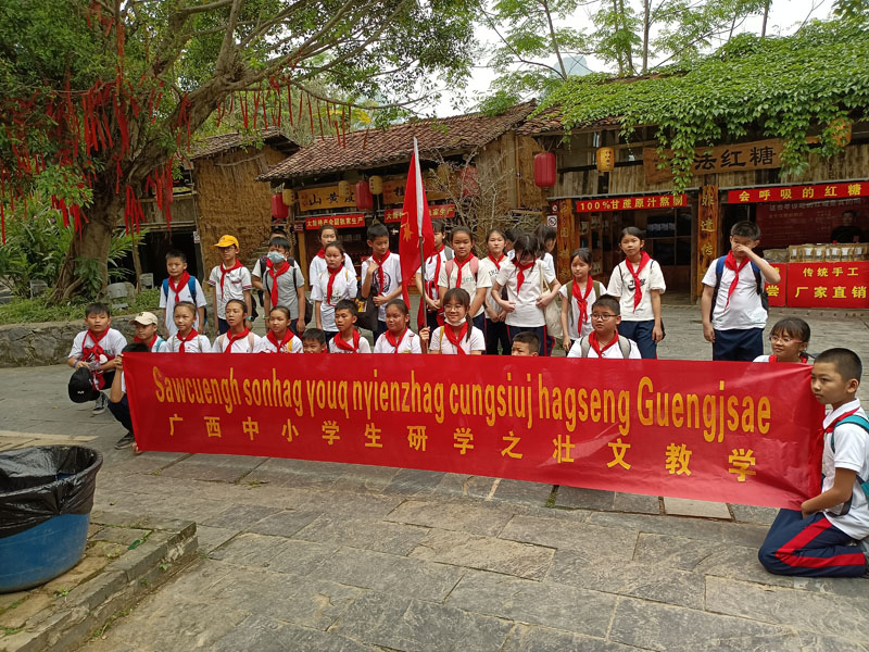 该校学生95%为本地壮族学生,但是仅有30%的同学会壮话,能用壮话交流的只有15%。本次研学活动的主办方邀请了第一批获得壮语文水平考试高级证书、热心推广使用壮语的陆海德老师给同学们上壮语课。