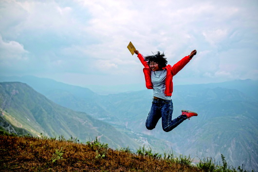 今年高考理科644分的会泽县考生范天兰,拿着通知书开心得蹦起来。(9月8日摄)记者江文耀摄