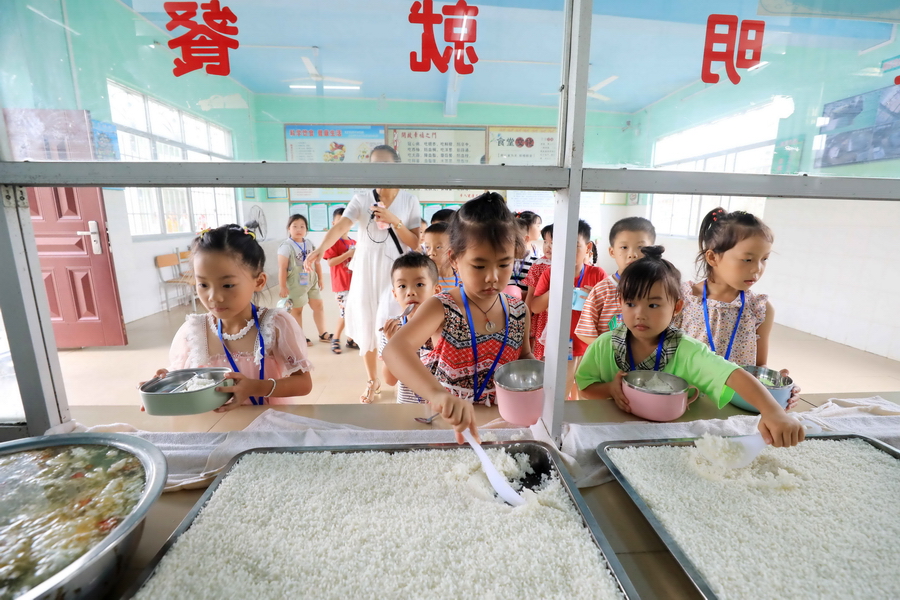 8月30日,在柳州市融安县大坡乡岗伟村小学,学生们在根据饭量盛饭。(谭凯兴 摄)
