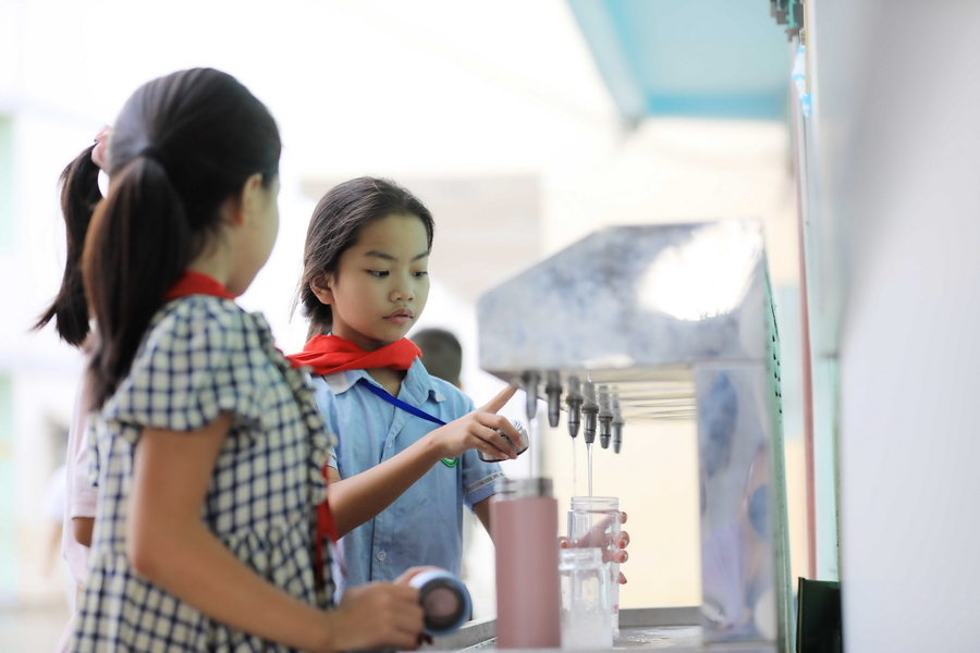 8月30日,在柳州市融安县大坡乡岗伟村小学,学生们在饭后接纯净水饮用。(谭凯兴 摄)