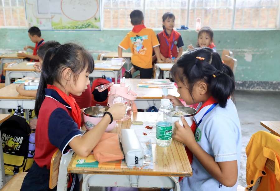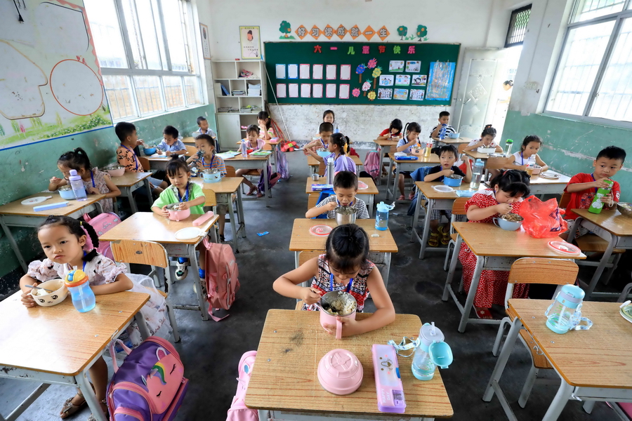 8月30日,在柳州市融安县大坡乡岗伟村小学,学生们在教室里吃营养午餐。(谭凯兴 摄)