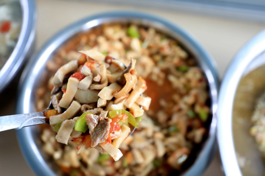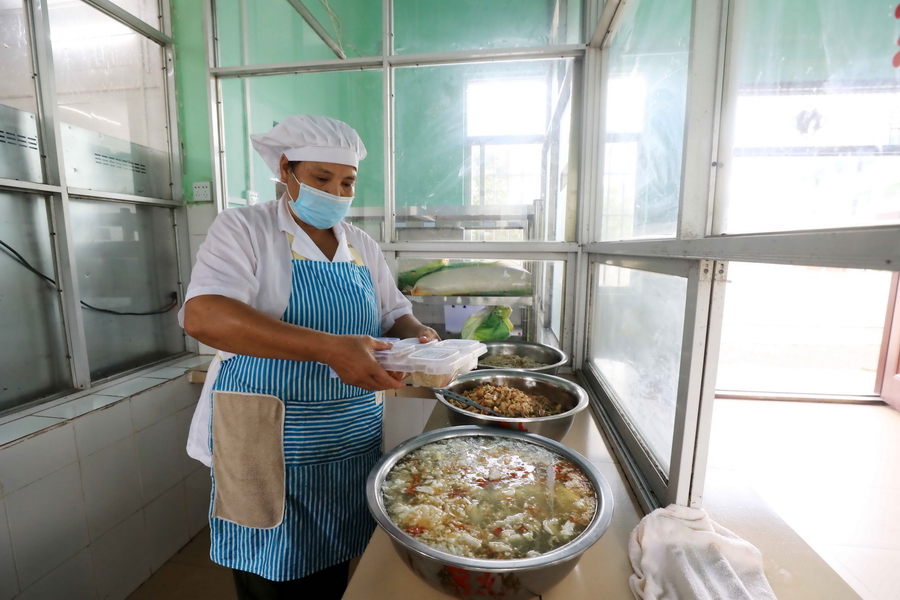 8月30日,在柳州市融安县大坡乡岗伟村小学,一名工作人员在为学生加菜。(谭凯兴 摄)