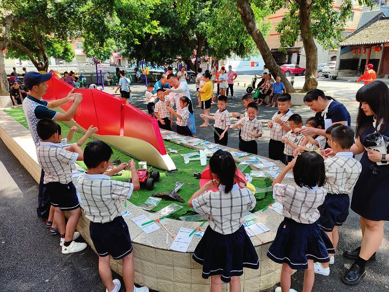 现场还举行了长卷绘画活动,小朋友们用水彩笔在长长的白色画卷上画了太阳、白云、大树等。最后,活动现场还开展了航模展演、手工制作和红色书籍阅读故事会等未成年主题实践活动。