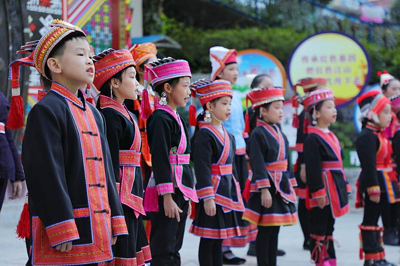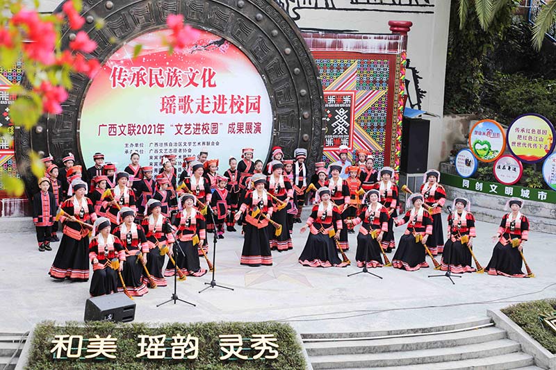 人民网金秀12月6日电 日前,在广西金秀瑶族自治县民族小学,“传承民族文化 瑶歌走进校园“广西文联2021年“文艺进校园“项目成果展演正在上演。来自当地的瑶族歌手、瑶族民间艺人以及县民族小学学生现场用最自然的声音、用最质朴的旋律唱响了茶山瑶、花篮瑶、坳瑶、盘瑶、山子瑶五大瑶族支系的原生态优秀民歌。
