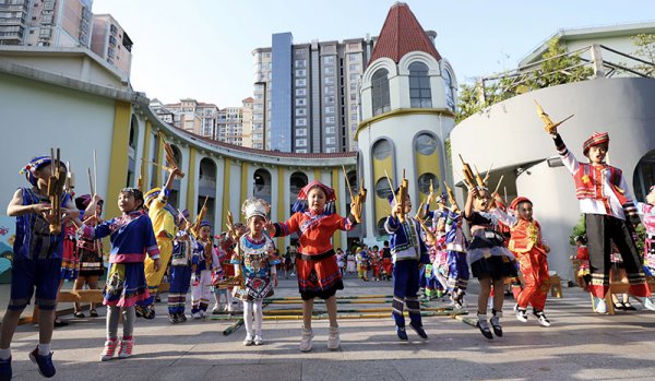 4月14日,广西南宁市青秀区维也纳森林幼儿园开展壮乡之情.音乐之笙主题活动。 一群身穿民族节日盛装的孩子,在非物质文化遗产代表性传承人贾征带领下,吹芦笙跳踩堂舞,一样身着民族盛装的老师们,欢快地跳起壮族扁担舞,和着芦笙踩堂舞,在校园里上演了一出浓郁民族风情的视听盛宴,奏起了春...