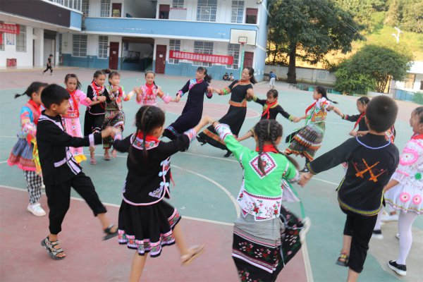各族师生转圈跳起民族风情舞。 本报隆林讯4月26日上午,广西隆林岩茶乡中心小学操场上,隆林苗族跳坡节音乐响起,身穿各民族节日服装的师生,在操场上拉手跳起苗族芦笙舞,转圈如彝族火把节绕着篝火跳舞,最后奔跑向中心促成一团如石榴籽这是该校展开民族文化进校园的生动一课,当天该校王秀...