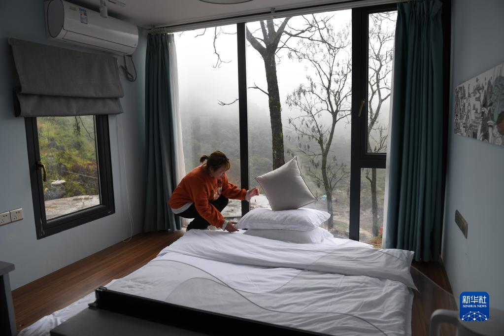 广西都安瑶族自治县隆福乡大崇村龙布屯,民宿服务员在整理客房。