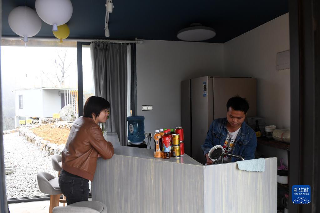 广西都安瑶族自治县隆福乡大崇村龙布屯,民宿服务员(右)为客人接水。