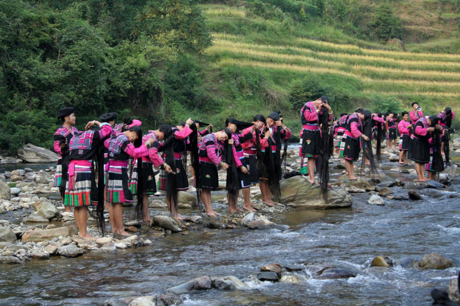 图为黄洛瑶寨妇女在金江河边梳长发